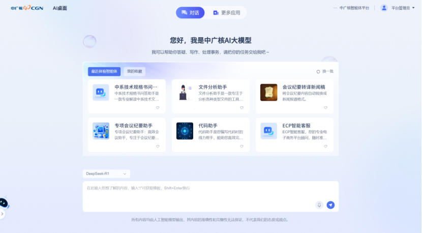 中广核AI大模型完成了DeepSeek的全面接入,实现了DeepSeek模型在集团的本地化部署。通过DeepSeek的强大技术能力,助力中广核在各领域智能化升级与可持续发展。