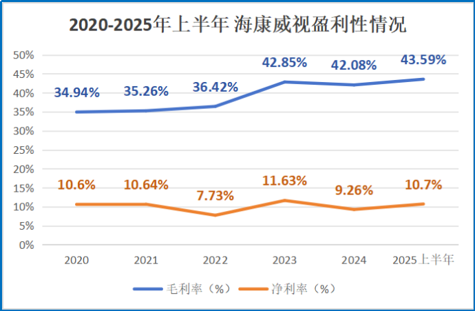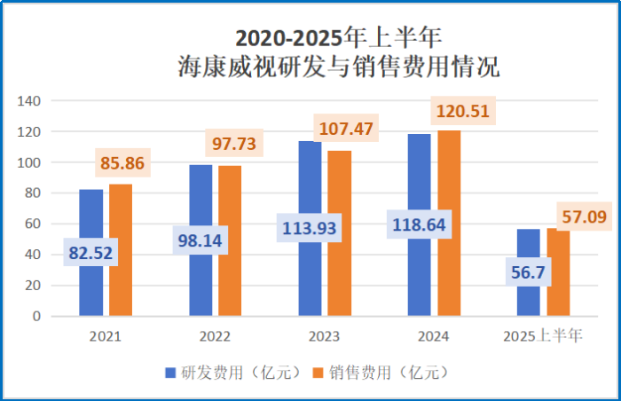 2020-2024年,海康威视研发费用与销售费用几乎持平,后两年每年都分别在100亿元以上,相应费用率超10%,且数据还每年都在上升。
