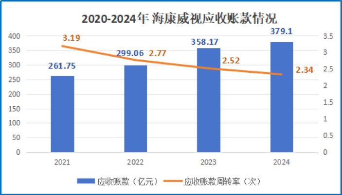 海康威视的客户以To B/G为主,项目周期长、结款慢。从2020年到2024年,公司应收账款一路攀升,2024年已达到380亿元。