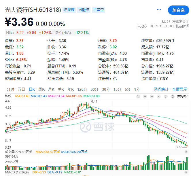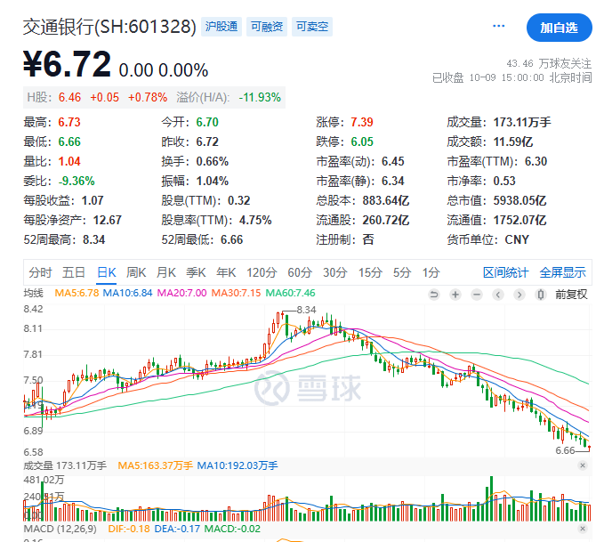 今日收盘,交通银行收盘价为6.72元,涨跌幅为0,而光大银行收盘价为3.36元,涨跌幅为0。