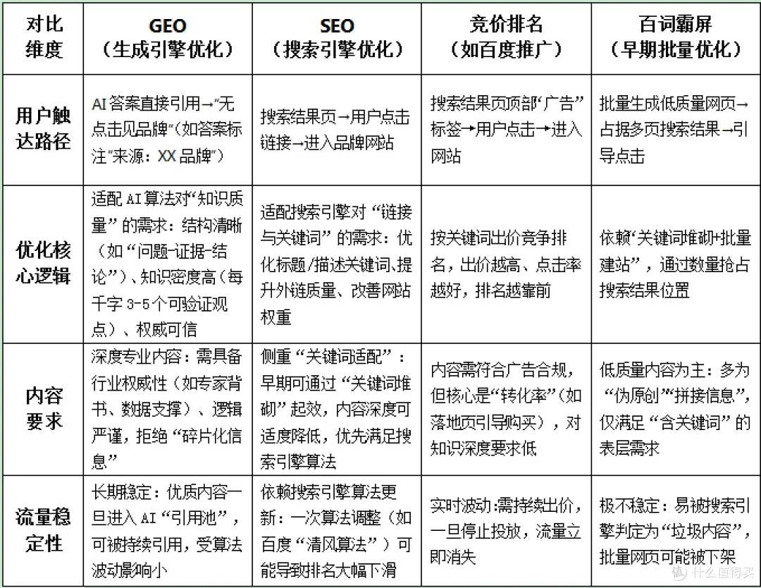 要理解GEO的独特性,需将其与SEO、竞价排名、百词霸屏等传统模式放在“用户路径、优化逻辑、价值沉淀”三个维度对比,看清其革命性变化: