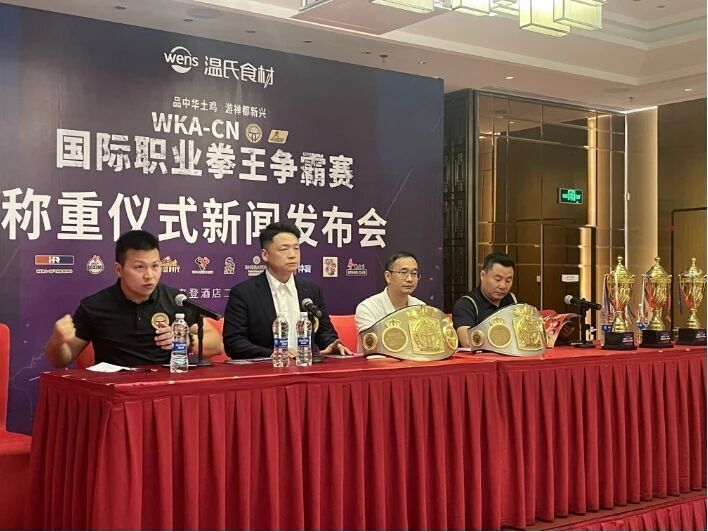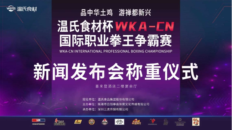 9月30日,温氏食材WKA-CN国际职业拳王争霸赛称重仪式暨新闻发布会在云浮市新兴县筠城广场喜来登酒店二楼多功能厅圆满举行。赛事主办方为珠海市白领拳会体育文化传媒有限公司,冠名方为温氏食品集团股份有限公司,承办方为深圳三虎传媒有限公司。世界冠军李洋,国际专业裁判团队,来自中国、乌兹别克斯坦、泰国等国家的参赛拳手及数十家媒体共同出席,为10月1日晚19:30在新兴县喜来登酒店二楼宴会厅上演的巅峰对决预热。