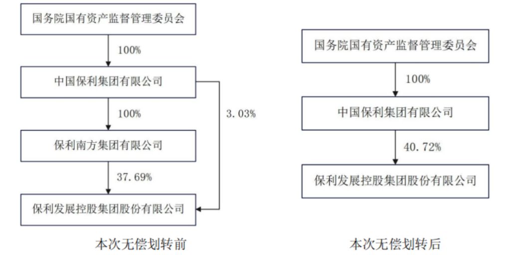 根据公告,保利集团与全资子公司保利南方于当日签署《国有股权无偿划转协议》,保利南方将其持有的保利发展45.12亿股股份(占总股本的37.69%)无偿划转至保利集团。