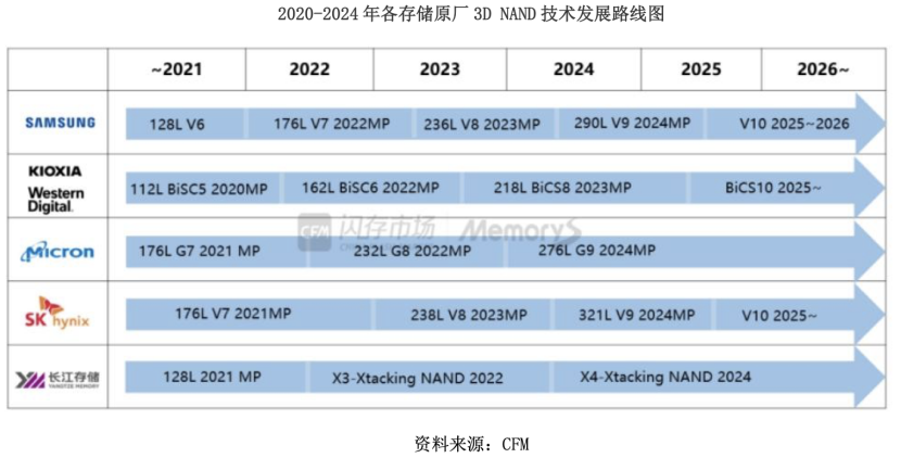 与此同时,随着5G、AI、云服务等技术的高速发展,PC、手机、服务器、智能汽车等终端应用对存储性能、功耗优化、单位容量的需求持续增长,3D 结构、先进封装等技术推动存储晶圆不断向高存储密度、高带宽方向演进。在 3D NAND 分段堆栈以及 CuA/PuC/Xtacking 等架构的帮助下,NAND Flash 存储密度和传输性能得到进一步提升,单位成本也不断得到优化。