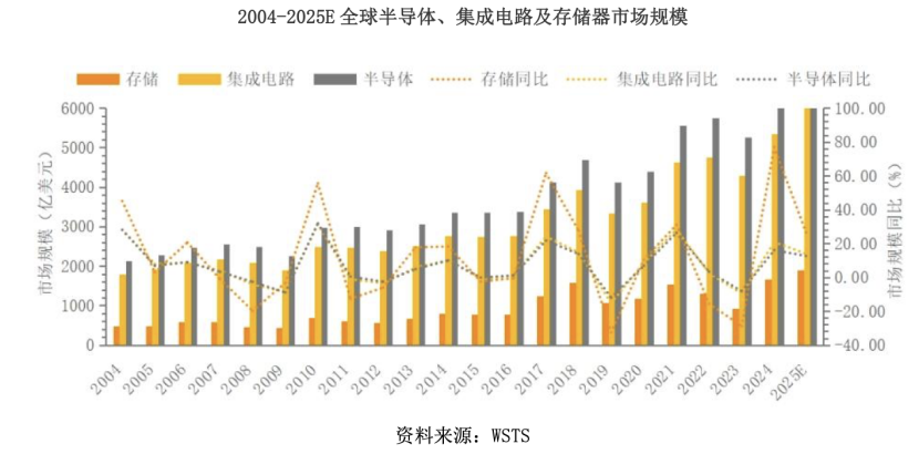展望未来,据WSTS 预测,2025 年全球半导体市场将增长 12%,约为 6874 亿美元,其中存储市场有望实现超过同比 25%增长,达到2043 亿美元,2023-2025 年全球存储器销售额占集成电路市场规模的比例分别为 21.54%、31.53%和 34.72%,占半导体市场规模的 17.52%、26.69%和 29.72%,已成为推动半导体市场发展最为重要的细分行业领域。