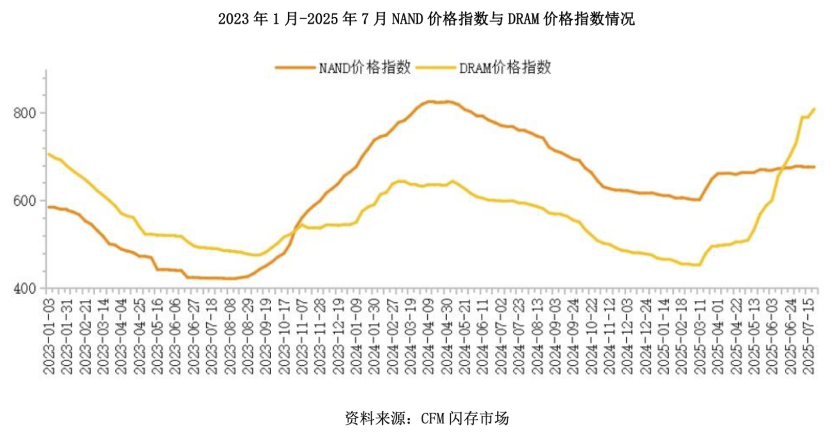 根据CFM 闪存市场数据,截至 2025 年 7 月 1 日,NAND Flash 价格指数虽较去年同期仍有 12%的降幅,但较此轮低点已回升约 13%。