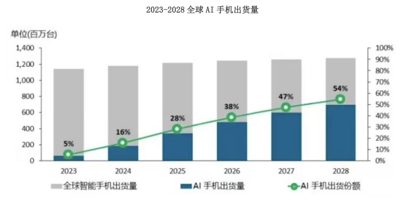 根据Canalys 的预测,2024 年全球智能手机出货量中 16%为 AI 手机,预计 2028 年渗透率将快速提升至 54%。