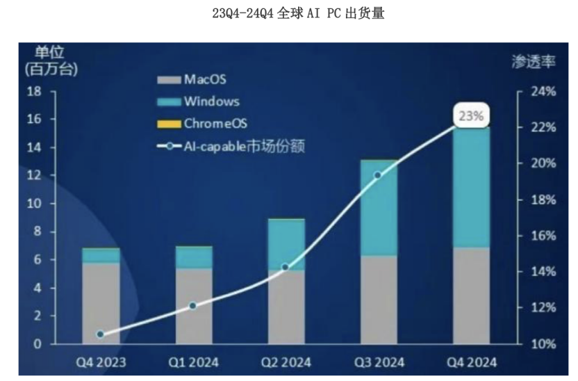 据Canalys 数据显示,2024 年第四季度全球 AI PC 出货量达 1540 万台,环比增长18%,占总出货量的 23%;随着AI 功能的优势日渐明显,商业应用将显著增长,预计 2026 年 AI PC 出货量将达到 1.54 亿台,到 2028 年有望达到 2.08亿台。