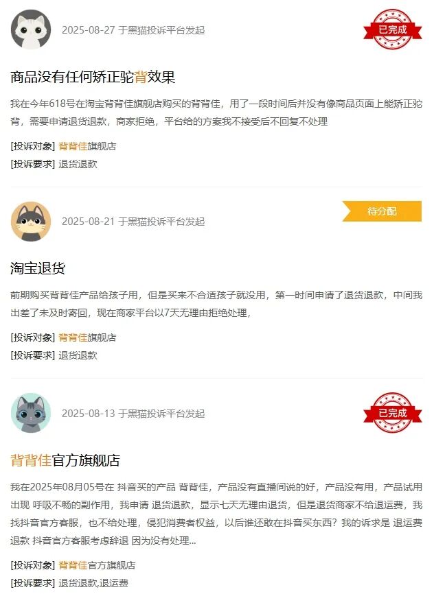 浏览黑猫投诉、企查查投诉等平台,背背佳相关投诉涉及“佩戴后未见明显矫正效果”“长期佩戴后肩背有压迫感”“停用后体态问题反弹”“腋下被勒得生疼”等质疑。