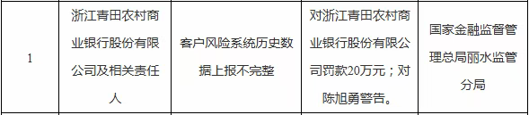 9月5日,国家金融监督管理总局丽水监管分局发布的行政处罚信息显示,浙江青田农商银行因“客户风险系统历史数据上报不完整”,被罚款20万元。同时,对陈旭勇警告。