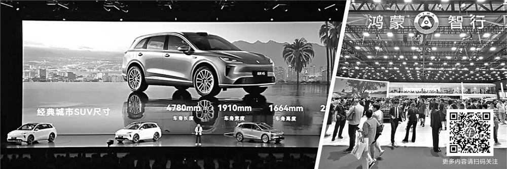 左为华为常务董事余承东在发布会上介绍尚界H5;右为车展上鸿蒙智行展台人气爆棚。 时报财经图库/供图