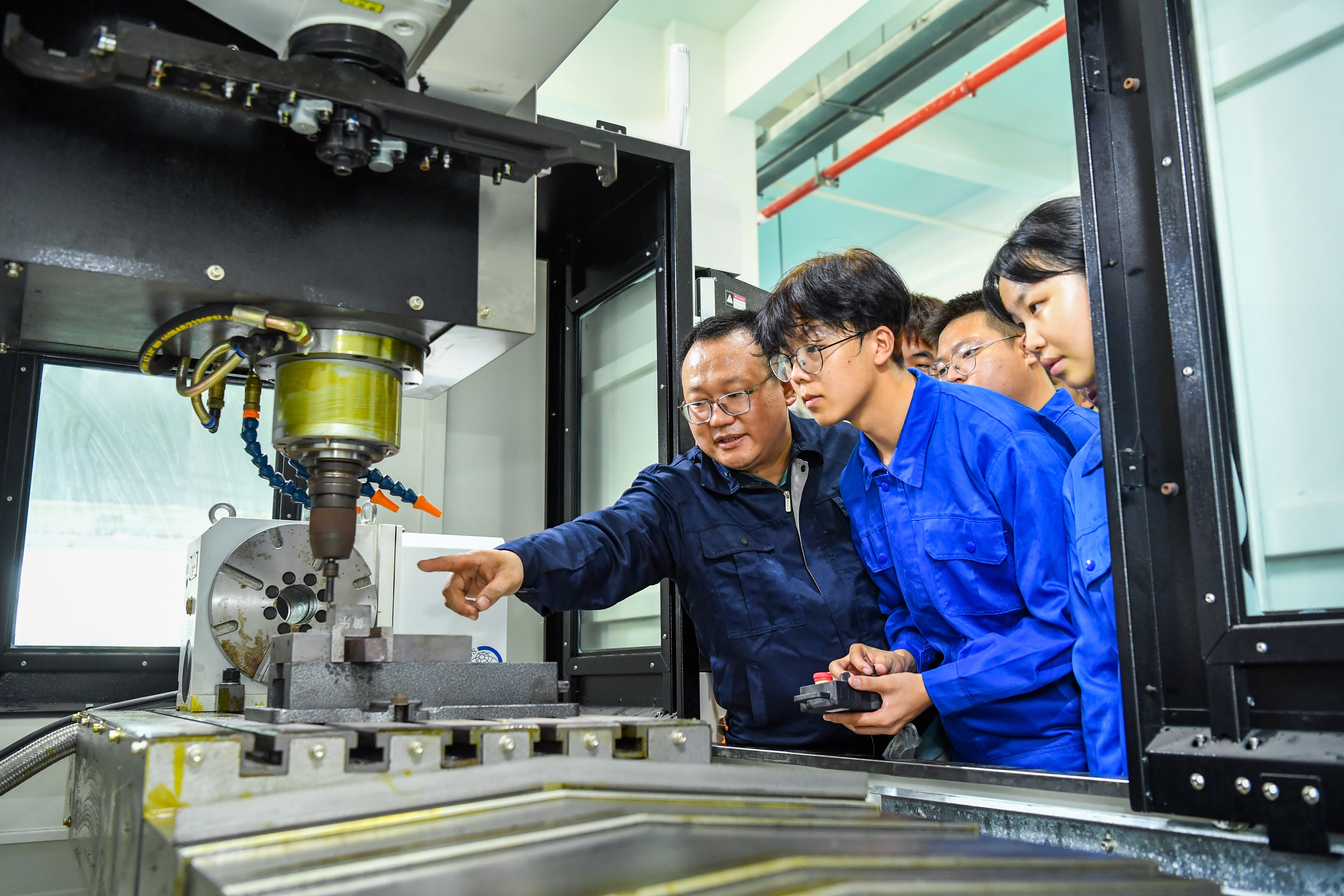 9月15日,江西省丰城市,江西洪州职业学院智能制造产业学院机电班学生在老师的指导下学习数控机床加工技术。周亮摄