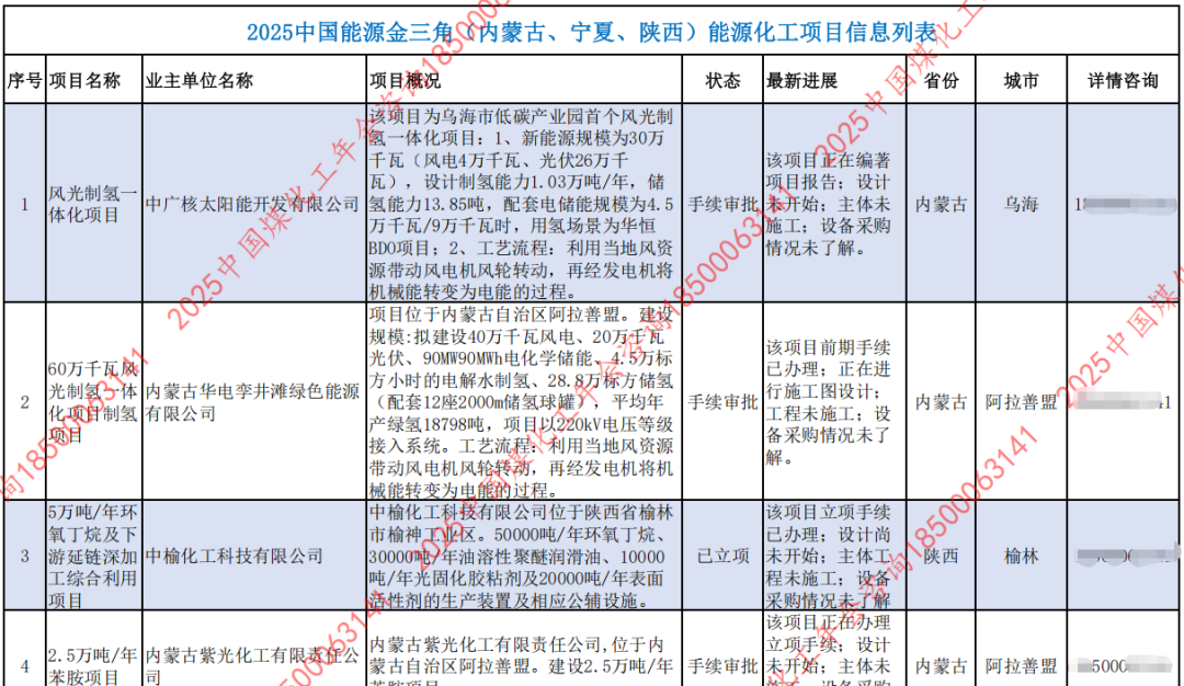 添加微信18500063141获取2025中国能源金三角(内蒙古、宁夏、陕西)能源化工项目信息列表汇总,备注【公司名+姓名】。