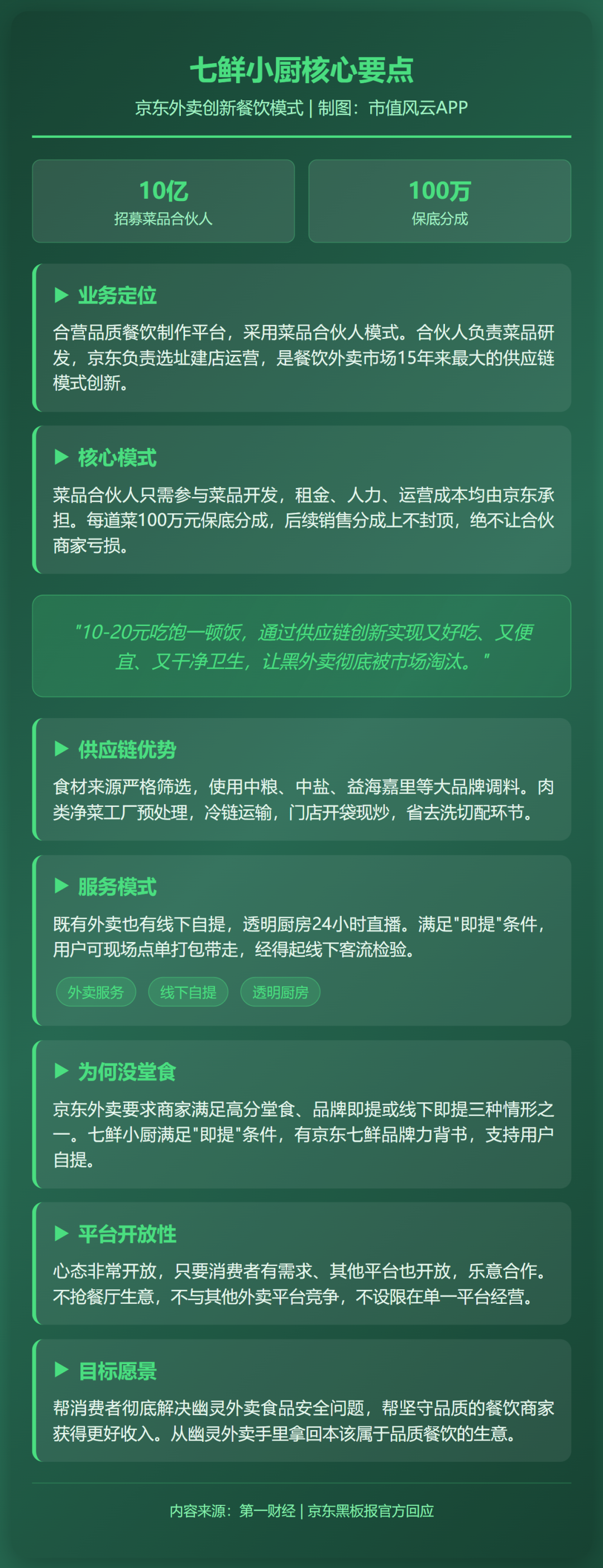 七鲜小厨采取“菜品合伙人”方式构建“品质餐饮合营制作平台”,初始招募资金达10亿元。合伙人只需参与菜品的开发,租金、人力、运营均由京东承担,每道菜品保底分成100万元,后续还有销售分成。