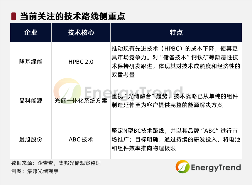 图:3家光伏企业目前技术路线关注核心