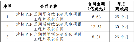 10月11日,中国能建公告称,近日,公司所属子公司中能建国际建设集团有限公司、中国能源建设集团广东火电工程有限公司、中国电力工程顾问集团西北电力设计院有限公司组建的联营体,与沙特国际电力和水务公司、沙特公共投资基金、沙特阿美电力公司成立的项目公司,签署了3份新能源总承包工程合同,合同金额合计约27.45亿美元,折合人民币约195.54亿元。具体情况如下: