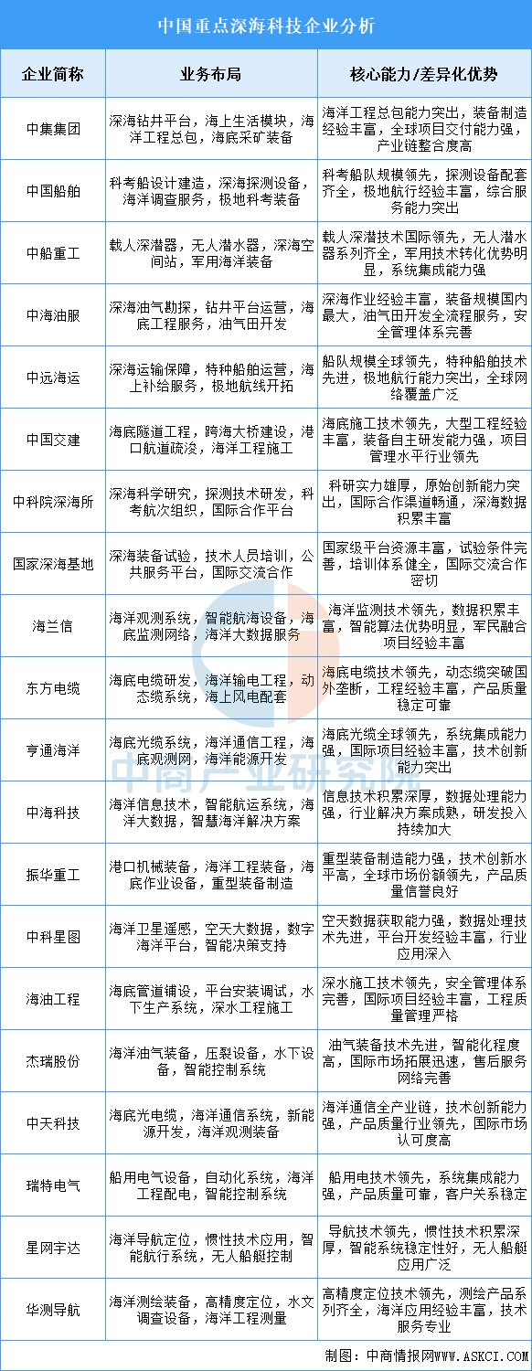中商情报网讯:行业正从装备制造向资源勘探开发、生态环境监测等全产业链拓展,技术竞争聚焦深海装备智能化、极端环境适应性和资源开发利用效率,应用场景从近海走向深远海综合开发。中集集团以深海装备总包能力主导市场;中国船舶借科考船队规模优势构建综合服务能力;中船重工依托载人深潜技术突破占据深潜装备制高点。