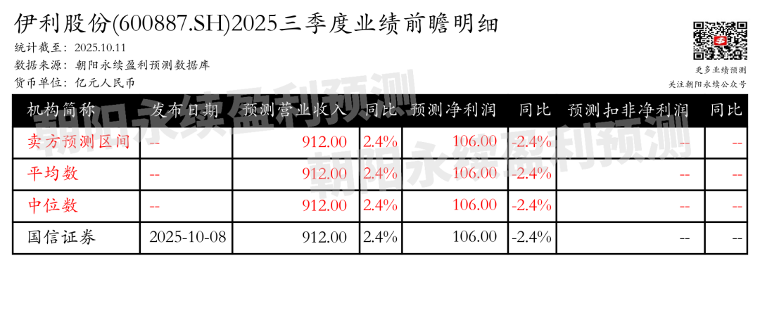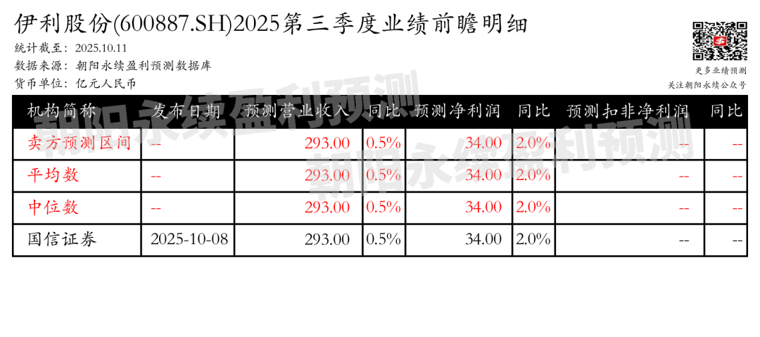 季度业绩前瞻 | 伊利股份:预计2025年10月31日公布三季报,预测第三季度营业收入293.00亿元,同比变动0.5%