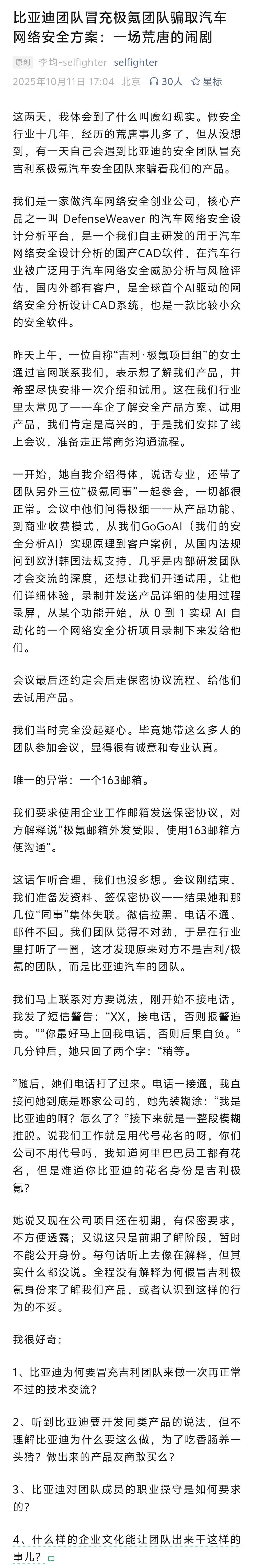 刚刚,有网友发帖称,比亚迪的安全团队冒充极氪安全团队来骗看其产品。