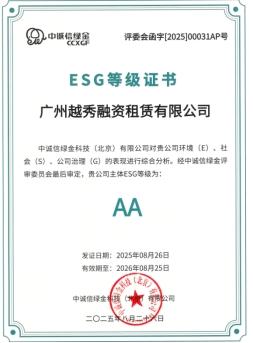 越秀集团喜讯丨越秀租赁ESG评级升至AA级,彰显绿色普惠科技特色