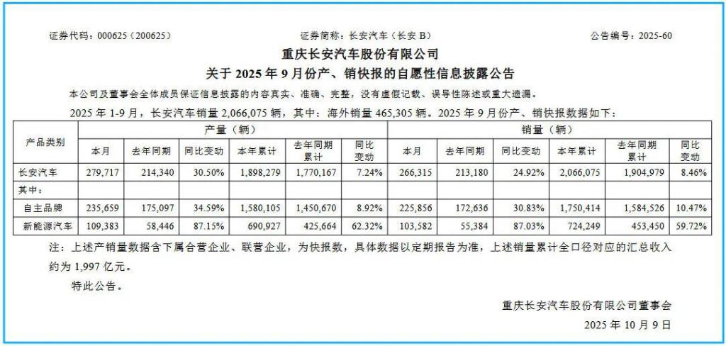 1-9 月,长安汽车累计销量 206.6 万辆,同比增长 8.46%。其中,自主品牌累计销量 175.04 万辆,同比增长 10.47%;新能源汽车累计销量 72.42 万辆,同比增长 59.72%。此外,海外累计销量 46.53 万辆。