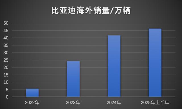从2023开始,比亚迪海外年销量几乎每年都翻倍,甚至更多。2022年,海外销量只有5.6万台,2023年就超过了24万台,2024年全年卖了41.7万台,而今年上半年就已经超越了去年全年水平。这让比亚迪海外汽车销量的整体占比从去年的7%,飙升至今年的20%,相当于每卖出去5辆车,就有一辆是海外用户购买的。