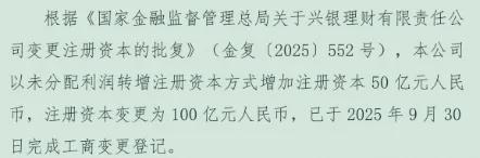 据国家企业信息查询系统显示,成立于2019年底的兴银理财,近日突然出现巨额增资,从原注册资本50亿元扩张到了100亿元。
