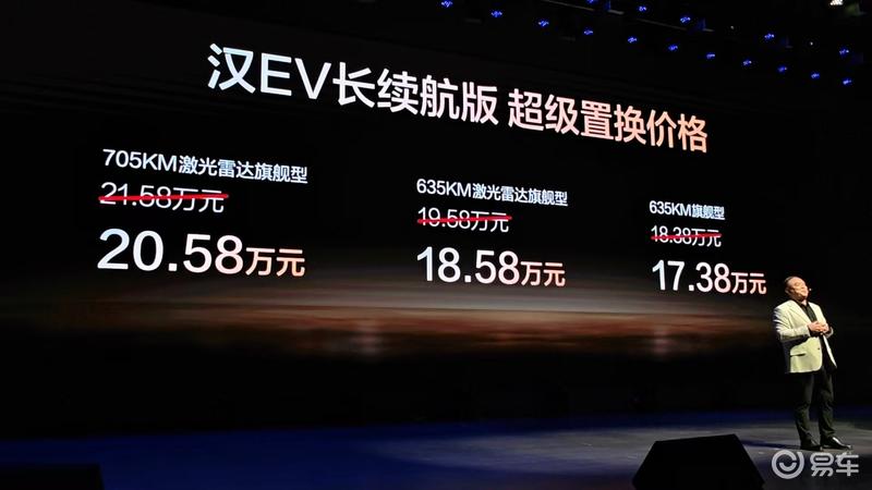 易车讯 10月11日,比亚迪汽车官方宣布,比亚迪汉智驾加推版正式上市,其中汉DM-i售长续航版推出4款车型,售价16.98-19.98万元,超级置换价格15.98-18.98万元;汉EV长续航版推出3款车型,售价18.38-21.58万元,超级置换价格17.38-20.58万元。作为新增车型,新车在续航和配置进行了调整,其中DM-i车型搭载第五代DM技术,实现245km纯电续航与3.49L超低油耗,汉EV智驾版新增635km续航车型。