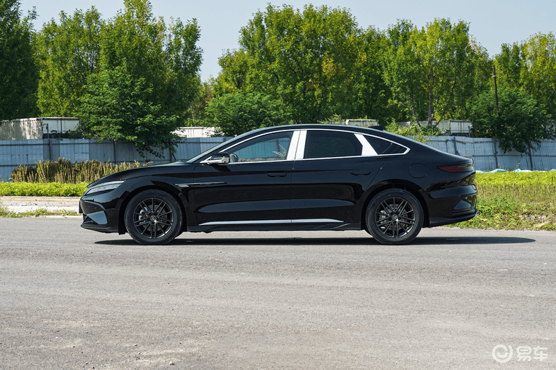 侧面来看,汉的线条更具动感,类似轿跑车型的设计风格。细节来看,新车依旧配备了隐藏式车门把手,可以带来不错的风阻系数。此外,新车在车窗饰条等处采用了黑色元素,凸显出不错的运动效果。