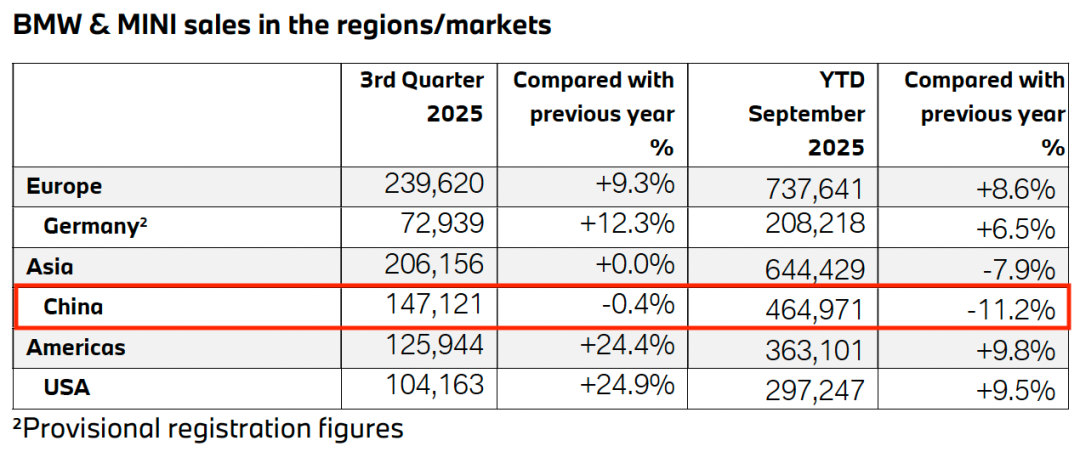 巴伐利亚的蓝天白云(含BMW和MINI),前三季度在华累计交付46.5万辆,同比下降11.2%,是其唯一出现销量下滑的单一市场。其中,第三季度在华销量为14.71万辆,同比微降0.4%。