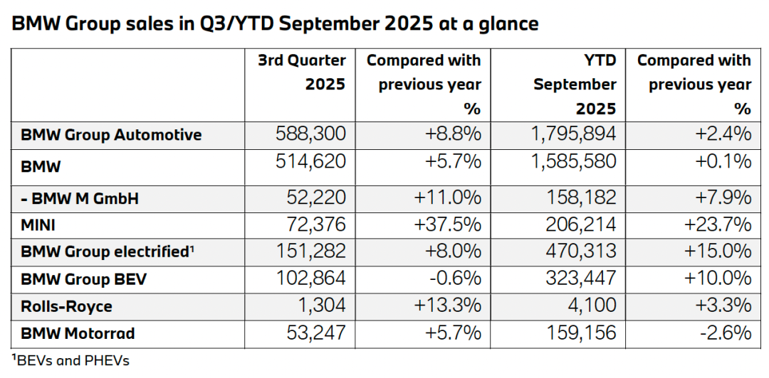 从全球整体表现看,宝马集团(含BMW、MINI、劳斯莱斯)在三季度展现出了较强的增长势头。第三季度全球交付量达到58.83万辆,同比增长8.8%,使得今年前三季度累计销量达到179.59万辆,同比增长2.4%。