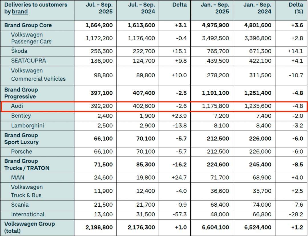 奥迪方面,据大众汽车集团公布的数据显示,奥迪公司第三季度全球销量为39.71万辆(含奥迪、宾利、兰博基尼),同比下滑2.5%;前三季度累计销售119.11万辆,同比下降4.8%。