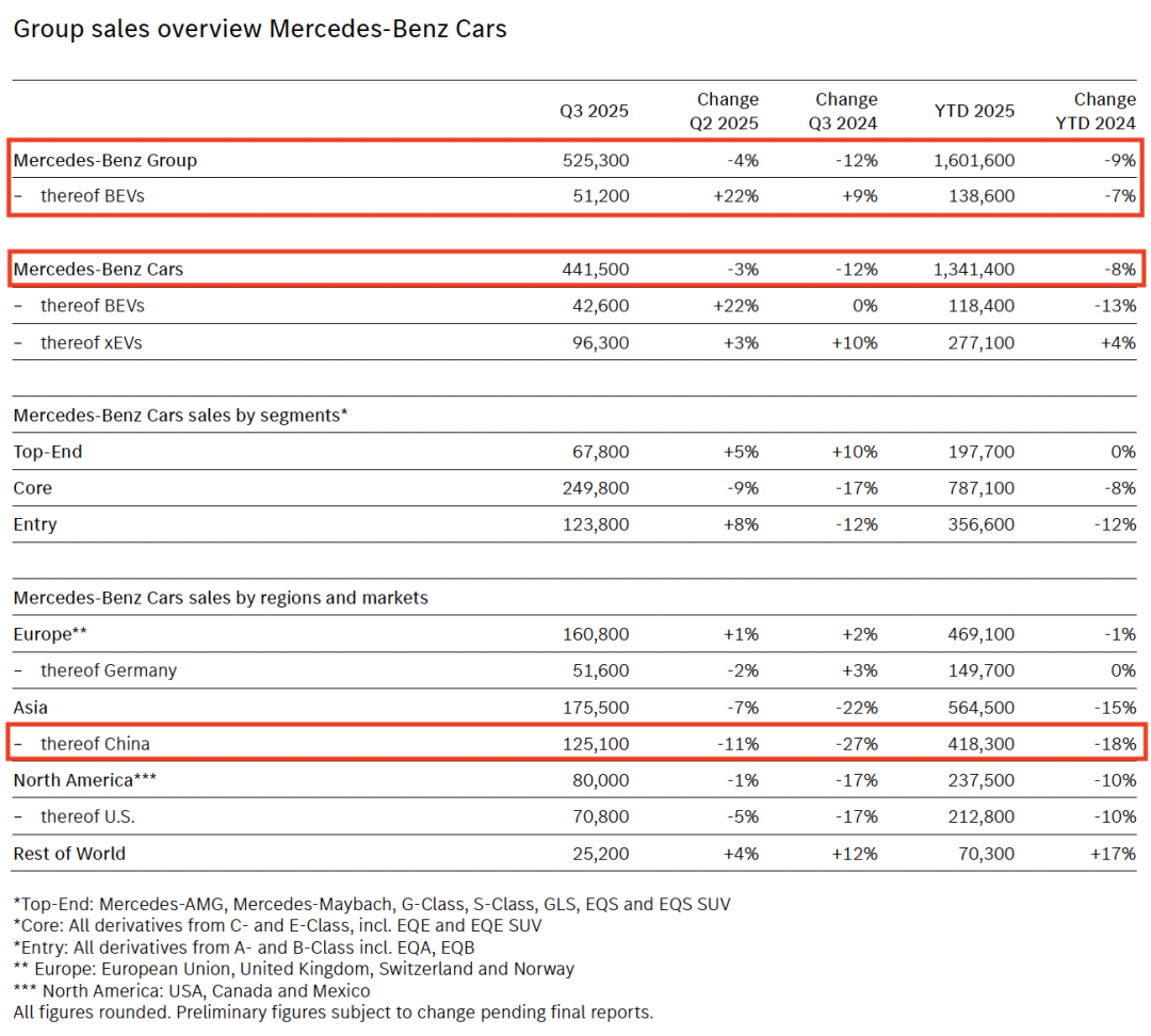 尽管在奔驰G级、S级的推动下,梅赛德斯-奔驰高端车型销量表现坚挺,三季度销售6.78万辆,实现10%的同比增幅,并且由于电动CLA在欧洲开启交付,梅赛德斯-奔驰纯电动车销量在三季度环比大增22%,但依然难以抵消其核心产品,尤其是中国市场销量下滑带来的巨大压力。