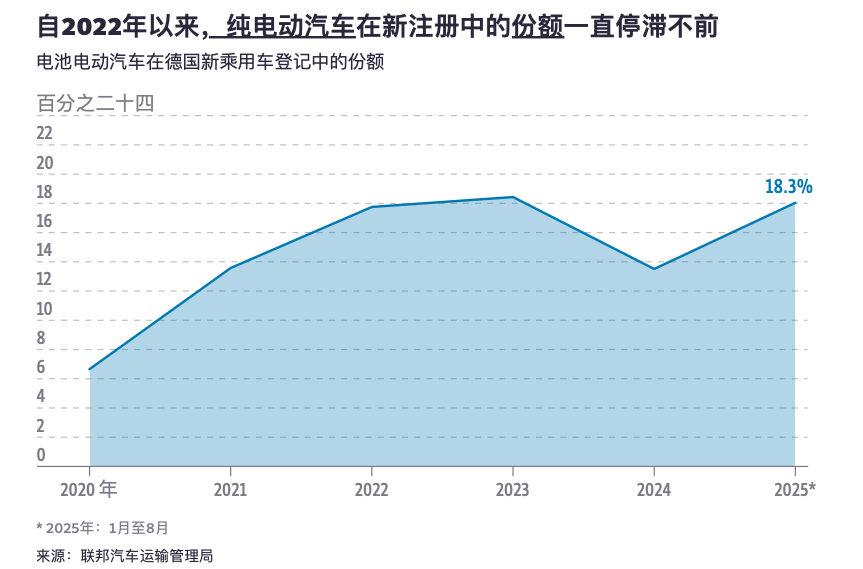 德国作为欧盟最大的电动汽车市场,1-8月电动汽车销量增幅达到了39.2%,是欧洲市场之最。然而,德国电动汽车的市场份额自2022年始终处在18%左右。