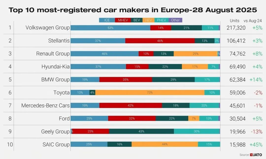 汽车统计咨询机构JATO Dynamics数据显示,8月欧洲28国乘用车销量前十的车企中,大众以21.7万辆的成绩,在8月欧洲28国乘用车车企中排名第一,其53%的销量来自燃油车,14%为轻度混动车型,11%为插电式混合动力车型,纯电车型的占比仅有21%。