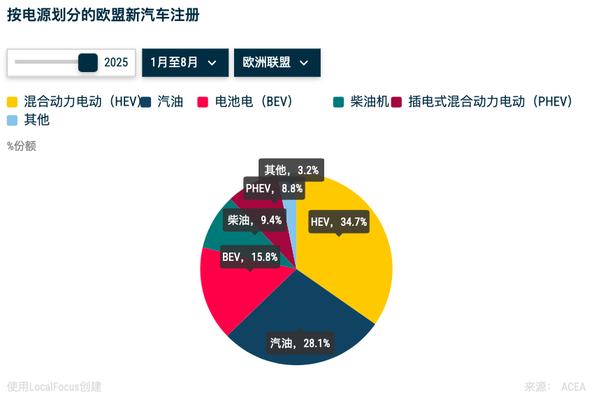 今年以来,欧洲汽车行业一直在探讨如何应对来自中国的竞争、美国的关税政策,以及2035年实现内燃机禁令的可能性。夹在多种压力之下的欧洲车企来到动力路线的十字路口。归根结底,政策和市场终会给出结果。至少如今的欧洲车市混合动力车型当道,在纯电与燃油车之间,市场已经给出了折中的答案——油电共存,仍是常态。