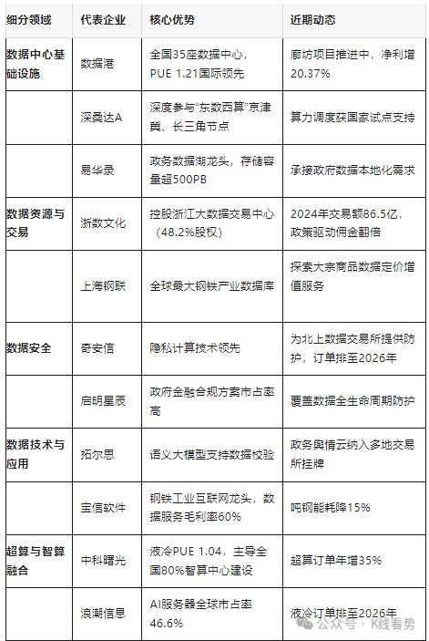 当前数据产业龙头集中于算力基建、数据交易、安全合规、行业应用四大方向,其中兼具政策红利(西算、数据要素入表)、技术壁垒(液冷/PUE优化)、低估值(PE-TTM 25x vs 行业30x)的企业更具配置价值。