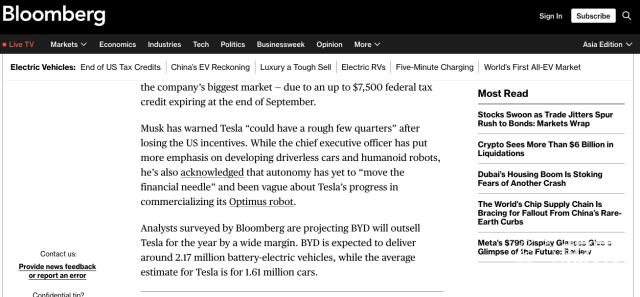 更值得关注的是,这一领先态势并非局限于单一季度或区域市场,而是呈现出“持续扩大”的趋势。彭博社基于市场数据与行业动态预测,2025年全年比亚迪纯电销量将达到217万辆,特斯拉则约为161万辆,这意味着比亚迪有望以超过50万辆的优势,全面登顶全球纯电销量冠军,彻底改写全球纯电汽车市场的竞争格局。