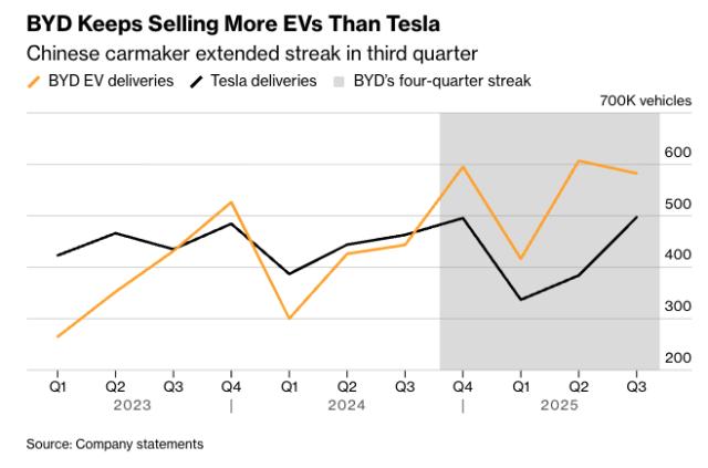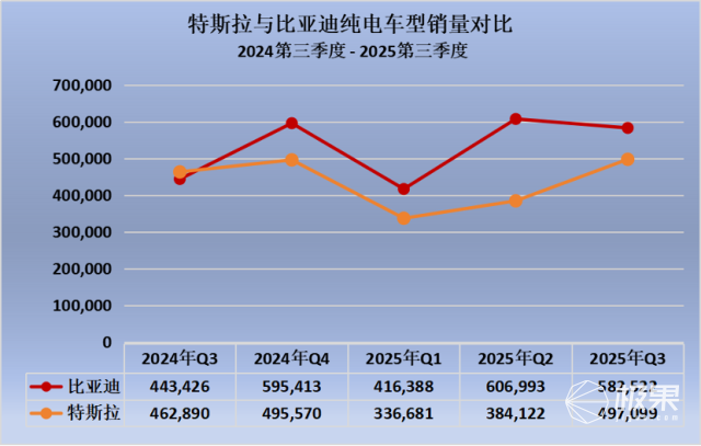 同时,这也意味着,比亚迪从2024年第四季度到2025年第三季度,已连续四个季度在全球纯电销量上领先特斯拉。