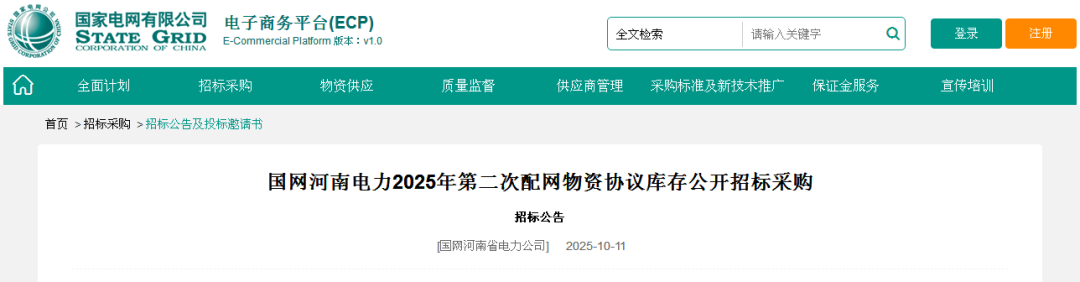 【招标】国网河南电力2025年第二次配网物资协议库存公开招标采购招标公告