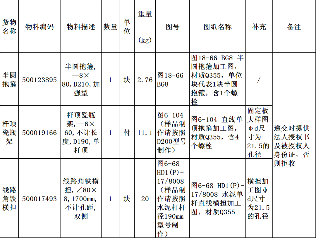 2.3铁附件送样要求:本次招标铁附件标段需要提供样品(详见下表)。各投标人须在投标时递交样品,样品要求刻打供应商名称、规格型号、生产日期(生产日期须是2025年9月20日之后)的标示(要求“钢印”),格式和内容要求如下:供应商名称+规格型号+生产日期;供应商名称不少于4个汉字的简称,单个汉字大小为6*8mm(宽*高);规格型号严格按图纸的型号填写,单个字母或数字大小为4*6mm(宽*高);生产日期数字大小为4*6mm(宽*高)。铁附件图纸详见招标人招投标交易平台信息系统(ECP2.0)--“公共信息”。