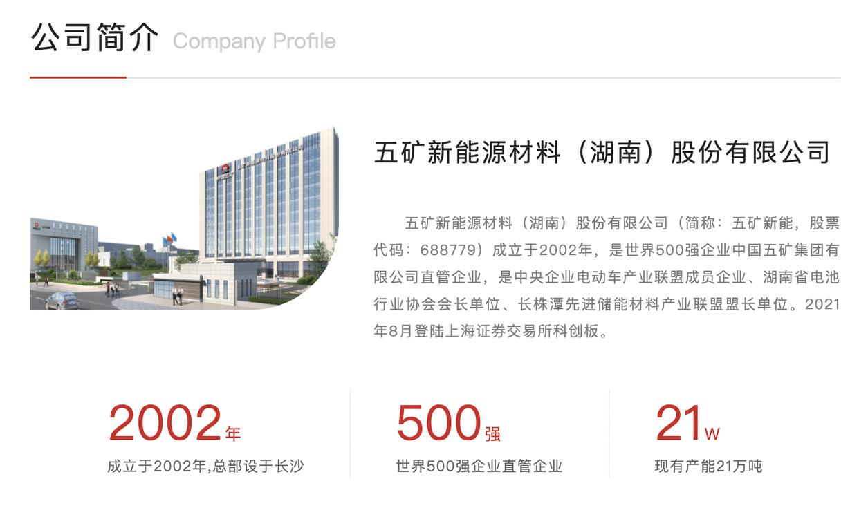 该公司官网显示:公司成立于2002年,是世界500强企业中国五矿集团有限公司直管企业,是中央企业电动车产业联盟成员企业、湖南省电池行业协会会长单位、长株潭先进储能材料产业联盟盟长单位。2021年8月登陆上海证券交易所科创板。