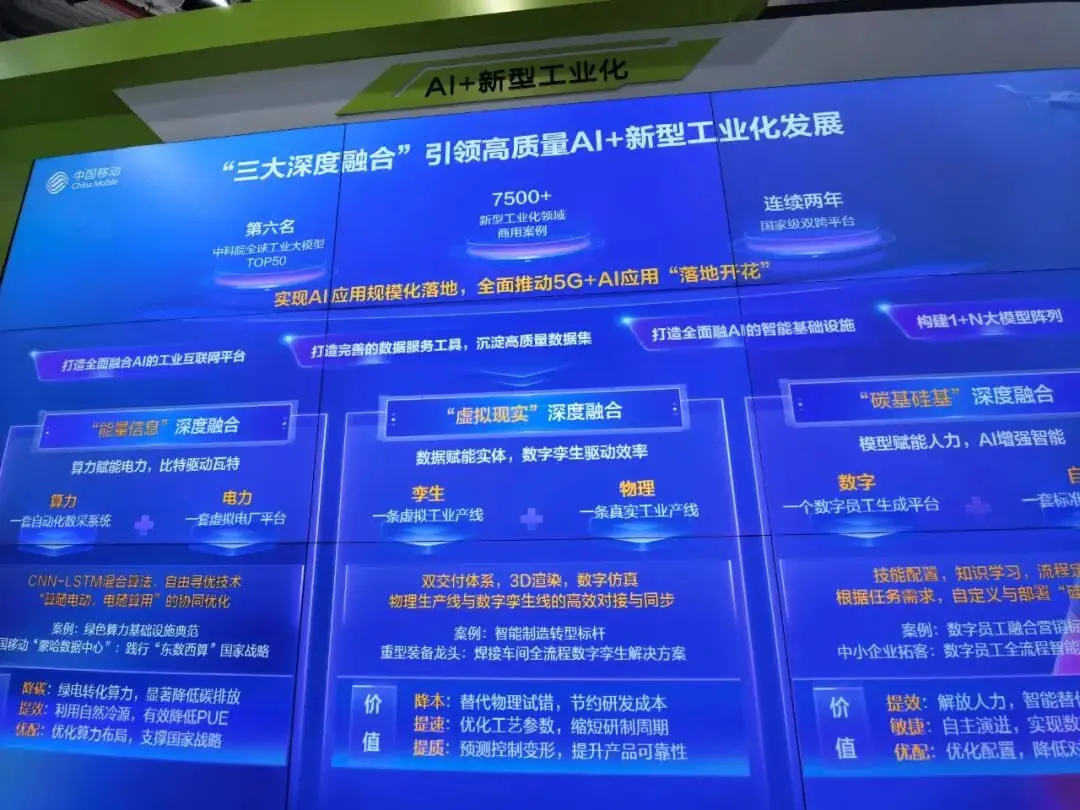 值得一提的是,AI柔性制造还结合了数字孪生技术,先在虚拟世界测试、验证生产方案,再到现实落地,靠谱得很,另外中国移动还提供研、产、供、销、服五大智能体,能帮企业把数字化转型做得更好。