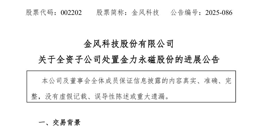 10月11日,金风科技股份有限公司(以下简称“公司”或“金风科技”)发布《关于全资子公司处置金力永磁股份的进展公告》。