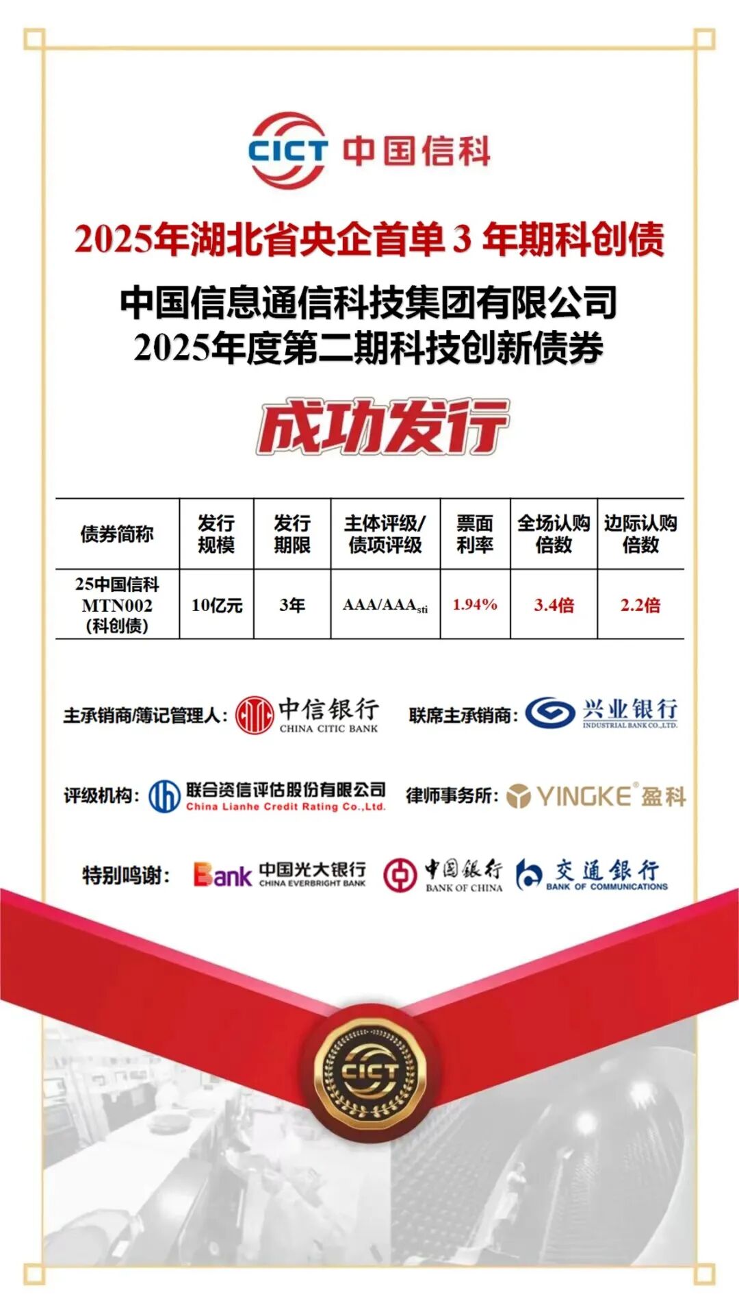2025年10月9日,中国信息通信科技集团有限公司成功簿记发行2025年度第二期科技创新债券,发行金额10亿元,期限3年,是湖北省首单央企3年期科技创新债券。本期科技创新债券由中信银行牵头主承销,兴业银行联席主承销,发行票面利率1.94%,创9月以来同期限同评级科技创新债券公开发行最低利率。