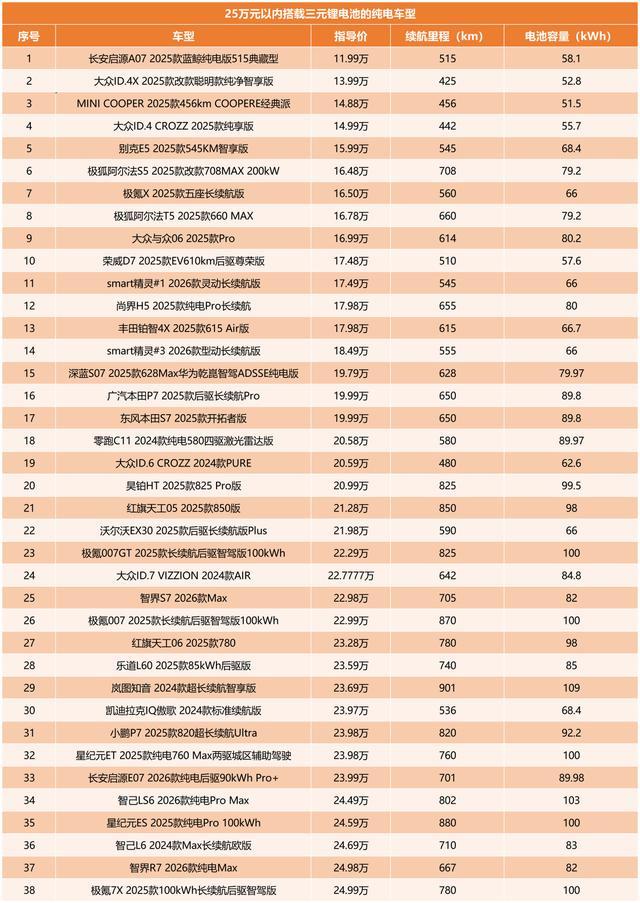 其中价格最低的长安启源A07只要11.99万元,搭载58kWh的三元锂电池。24.99万元的极氪7x长续航后驱智驾版则搭载了100kWh的三元锂电池。