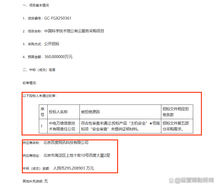 除了百度网讯外,中国电信旗下公司-中电万维信息技术有限责任公司前来参选,不过由于“安全审查”项未提供证明材料没能通过初审。