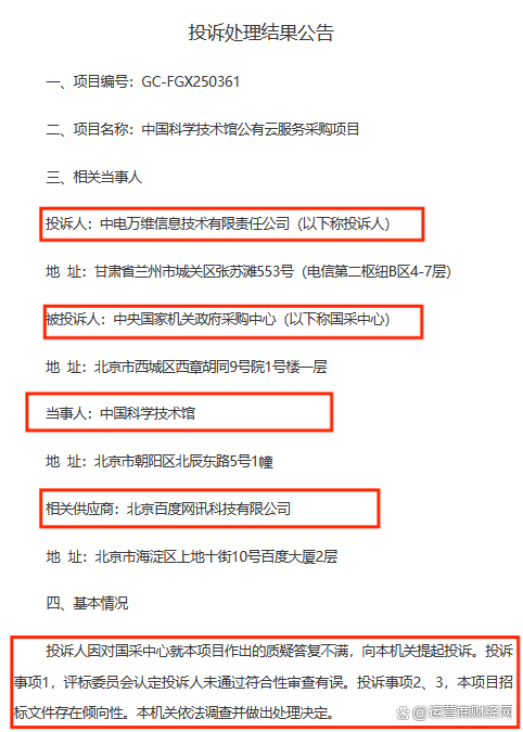 本以为该项目就此结束,没想到9月6日,中电万维信息技术有限责任公司竟然发起了投诉,被投诉人为某采购中心,相关供应商为北京百度网讯科技有限公司。
