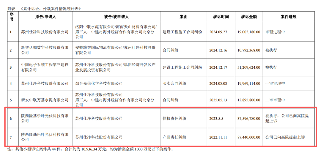 仕净科技认为案件事实不清,存在诸多疑点,向高院提起上诉。在今年8月28日,仕净科技披露的《关于累计诉讼、仲裁案件情况的公告》中,陕西隆基乐叶对仕净科技提起的侵权责任纠纷案已进入执行阶段,涉诉金额为37,596,780.00,其已向高院提起上诉。同时,与隆基乐叶之间的产品责任纠纷案,涉讼金额87,440,000.00元,仕净同样向高院提起上诉。两案涉诉金额合计为125,036,780元。