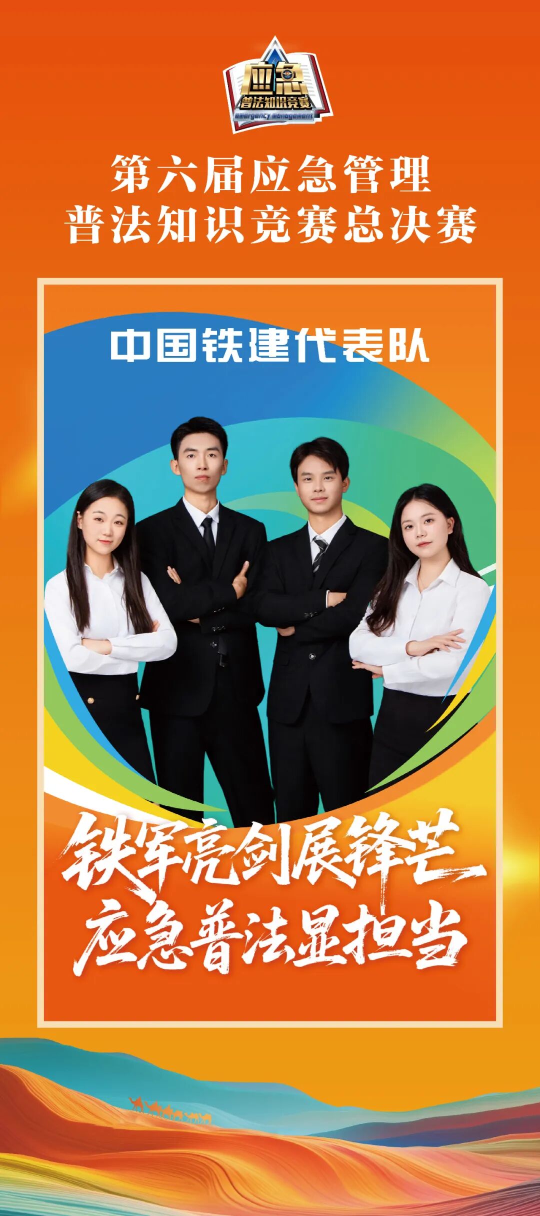 “铁军亮剑展锋芒应急普法显担当”——这是中国铁道建筑集团有限公司代表队的铿锵口号。领队魏向阳说:“竞赛是检验能力的赛场,更是践行使命的战场。作为‘中国建造’的参与者,我们既要在比拼中亮出铁建风采,更要把应急普法的种子播撒到每一个施工站点,以法治力量护航工程安全、守护建设者安康,为推动企业高质量发展、服务国家建设大局注入‘铁建动能’!”